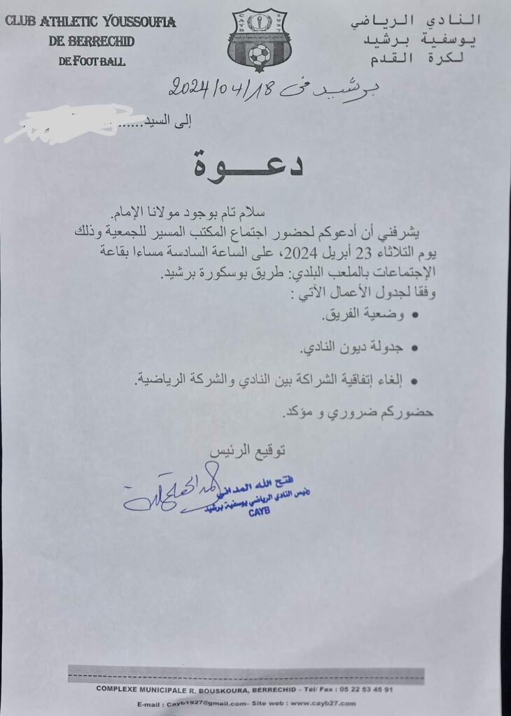 عاجل وخطير قام رئيس النادي الرياضي يوسفية برشيد لكرة القدم بدعوة منخرطيه وأعضاء المكتب وذلك من أجل فسخ اتفاقية شراكة مع الشركة الرياضية.