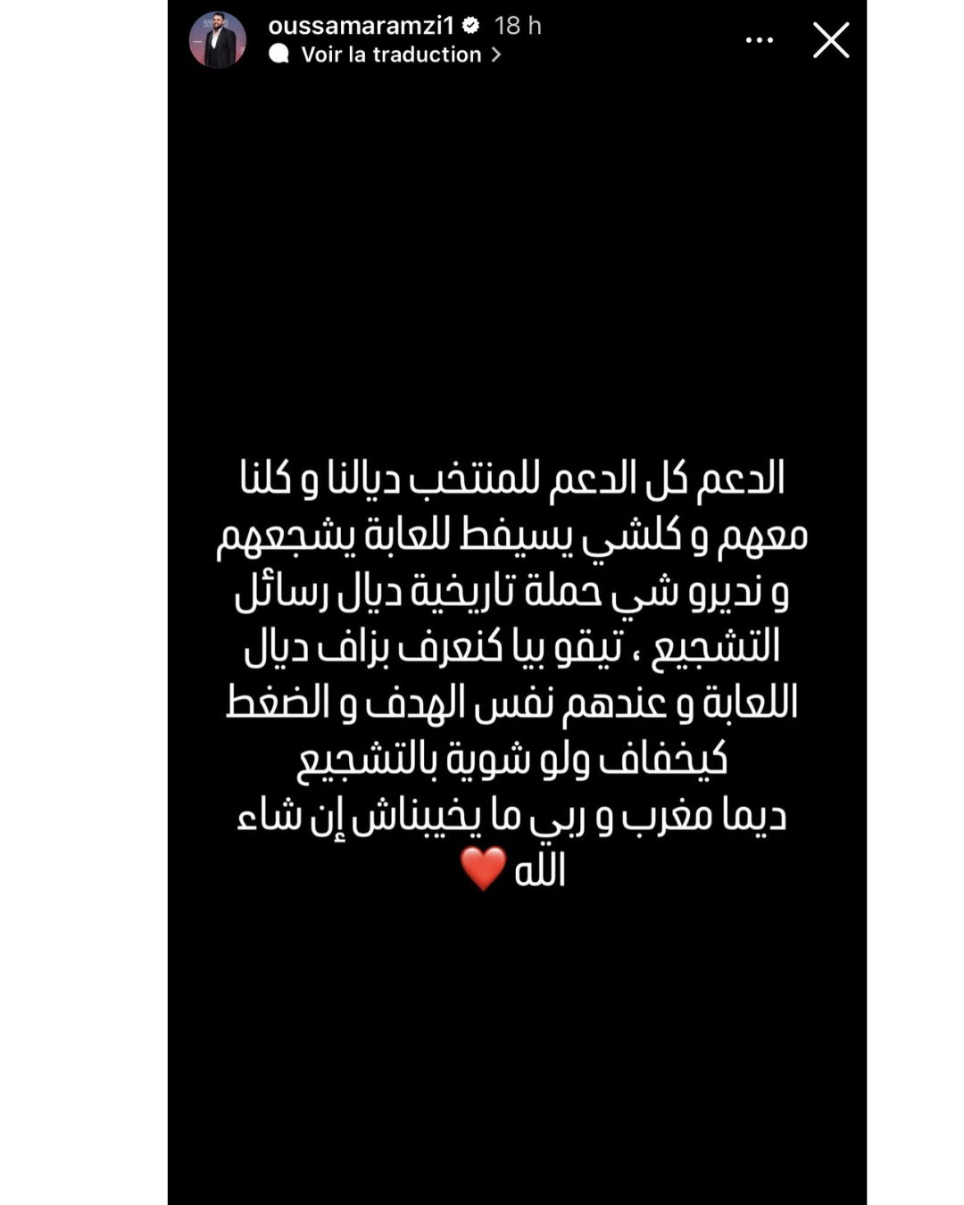 وجاء في تدوينة لأسامة رمزي “الدعم كل الدعم للمنتخب ديالنا وكلنا معهم وكلشي يسيفط للعابة يشجعهم ونديرو شي حملة تاريخية ديال رسائل التشجيع، تيقو بيا كنعرف بزاف ديال اللعابة وعندهم نفس الهدف والضغط كيخفاف ولو شوية بالتشجيع، ديما مغرب وربي ما يخيبناش إن شاء”.