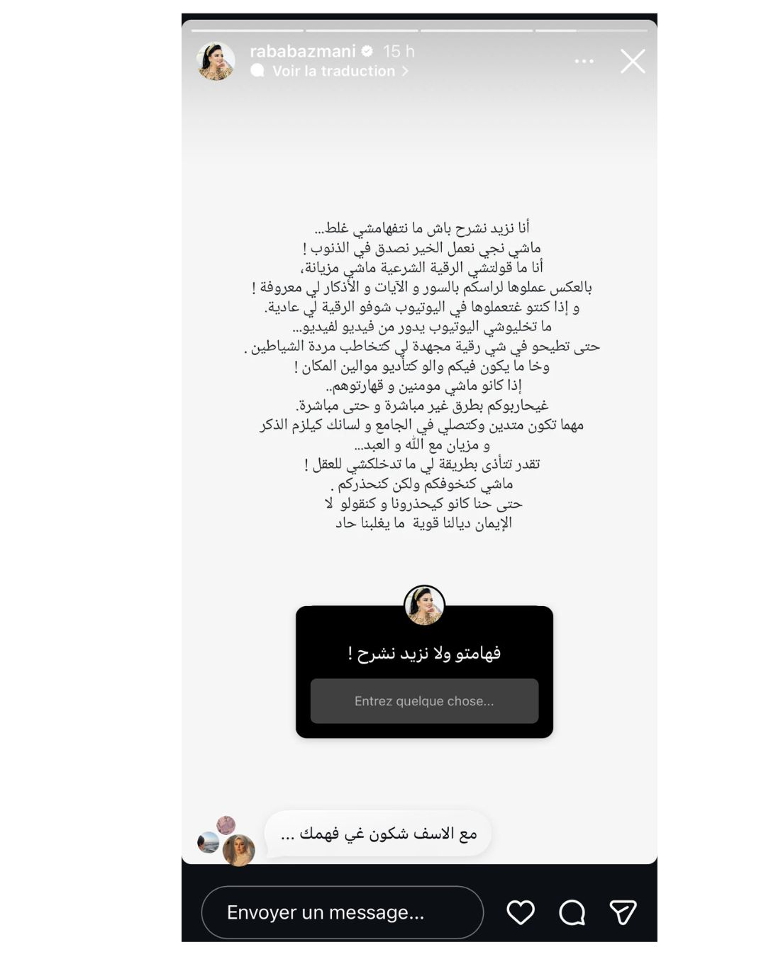 وجاء في توضيح رباب عبر خاصية الستوري على حسابها الرسمي بموقع تبادل الصور والفيديوهات انستغرام “أنا نزيد نشرح باش ما نتفهامشي غلط….. ماشي نجي نعمل الخير نصدق في الذنوب ! أنا ما قولتشي الرقية الشرعية ماشي مزيانة، بالعكس عملوها لراسكم بالسور والآيات و الأذكار لي معروفة ! و إذا كنتو غتعملوها في اليوتيوب شوفو الرقية لي عادية. ما تخليوشي اليوتيوب يدور من فيديو لفيديو….. حتى تطيحو في شي رقية مجهدة لي كتخاطب مردة الشياطين . وخا ما يكون فيكم والو كتأديو موالين المكان ! إذا كانو ماشي مومنين و قهارتوهم. غيحاربوكم بطرق غير مباشرة و حتى مباشرة”.